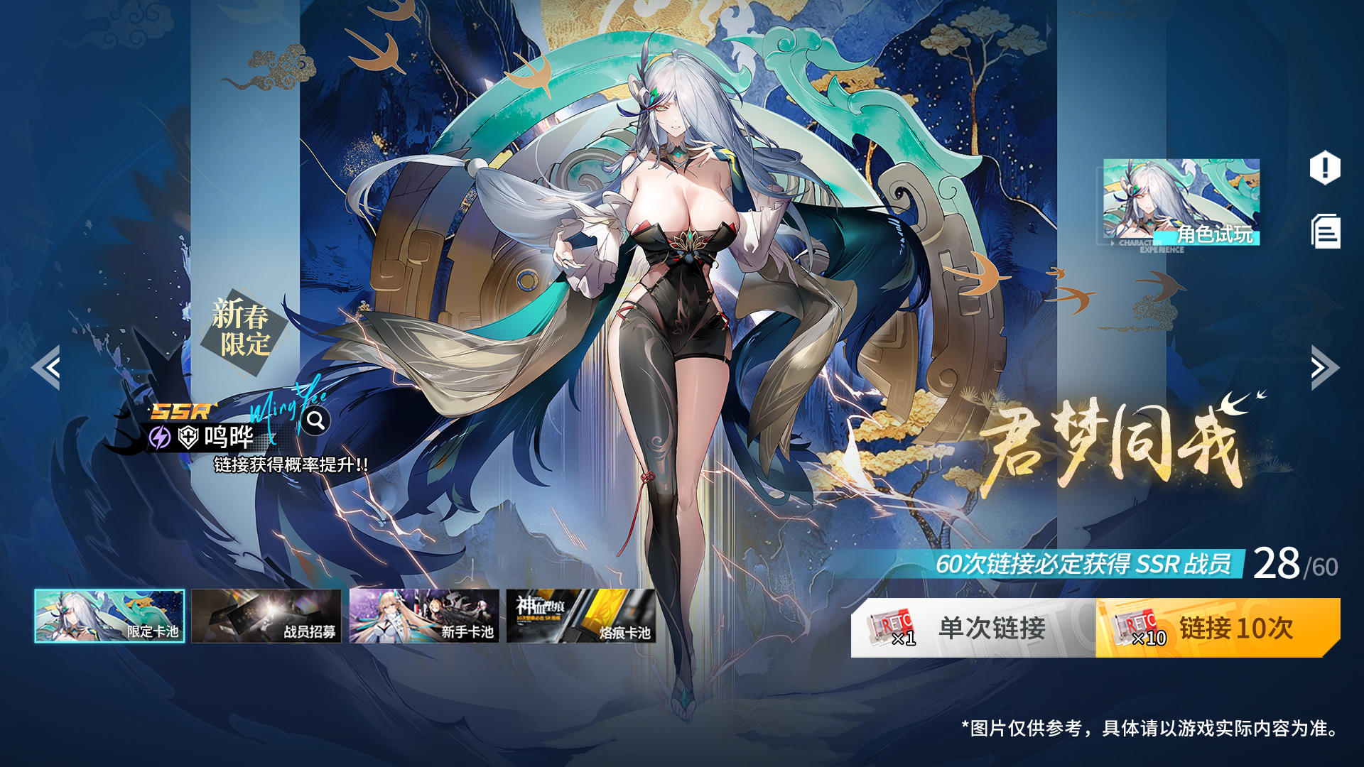 2.「君梦同我」链接卡池开启!UP 战员「新春限定·鸣晔」链接概率提升,累计180 次链接必出「新春限定·鸣晔」。