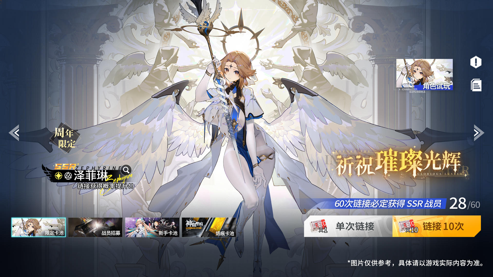 2.「祈祝璀璨光辉」链接卡池开启!UP 战员「周年限定·泽菲琳」链接概率提升,累计180 次链接必出「周年限定·泽菲琳」。