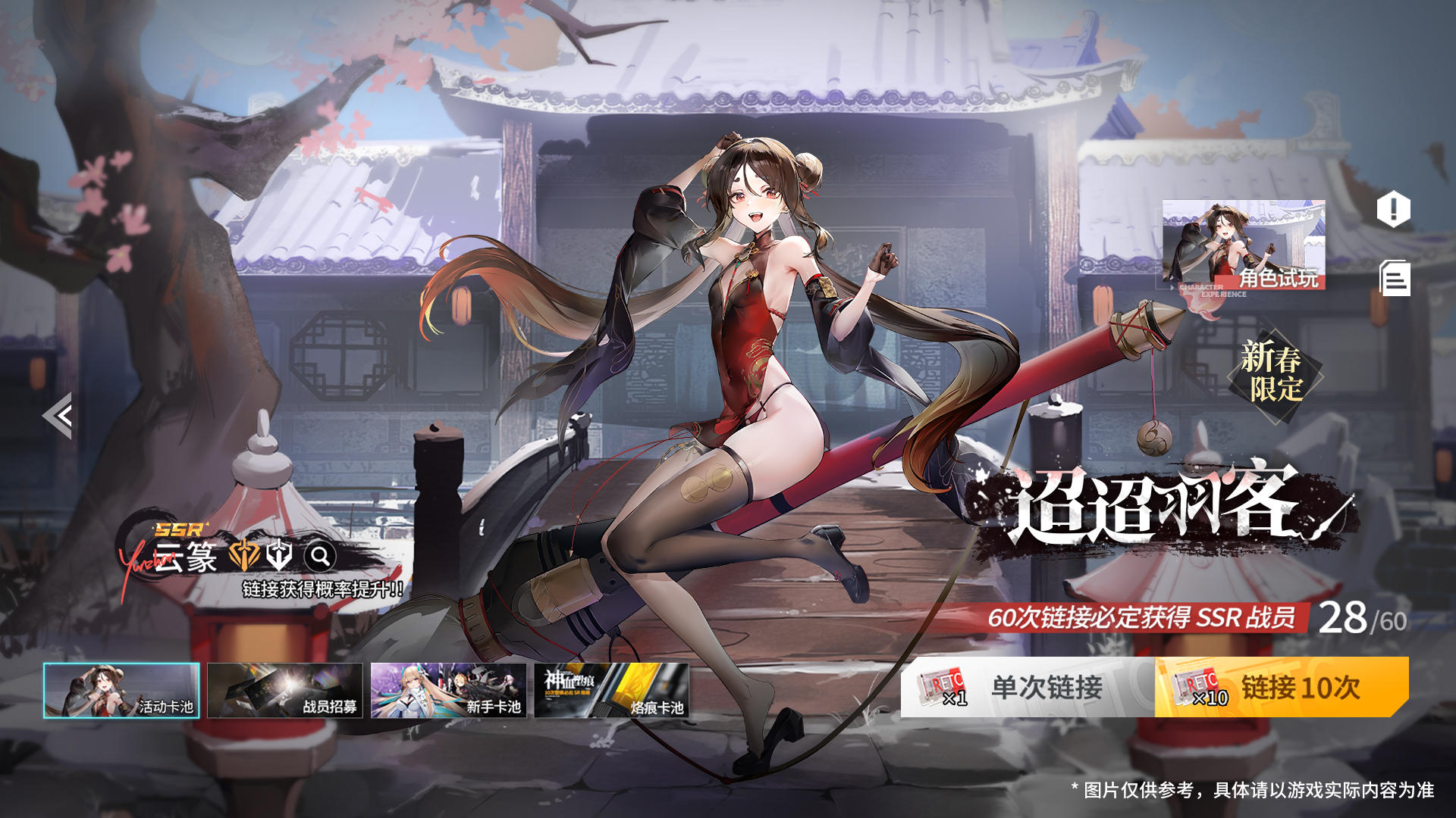 2.「迢迢羽客」链接卡池开启!UP 战员「新春限定·云篆」链接概率提升,累计180 次链接必出「新春限定·云篆」。