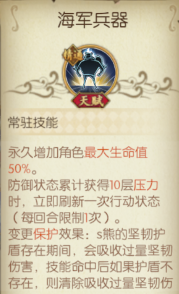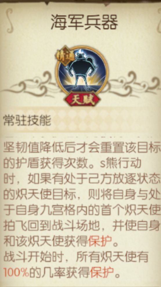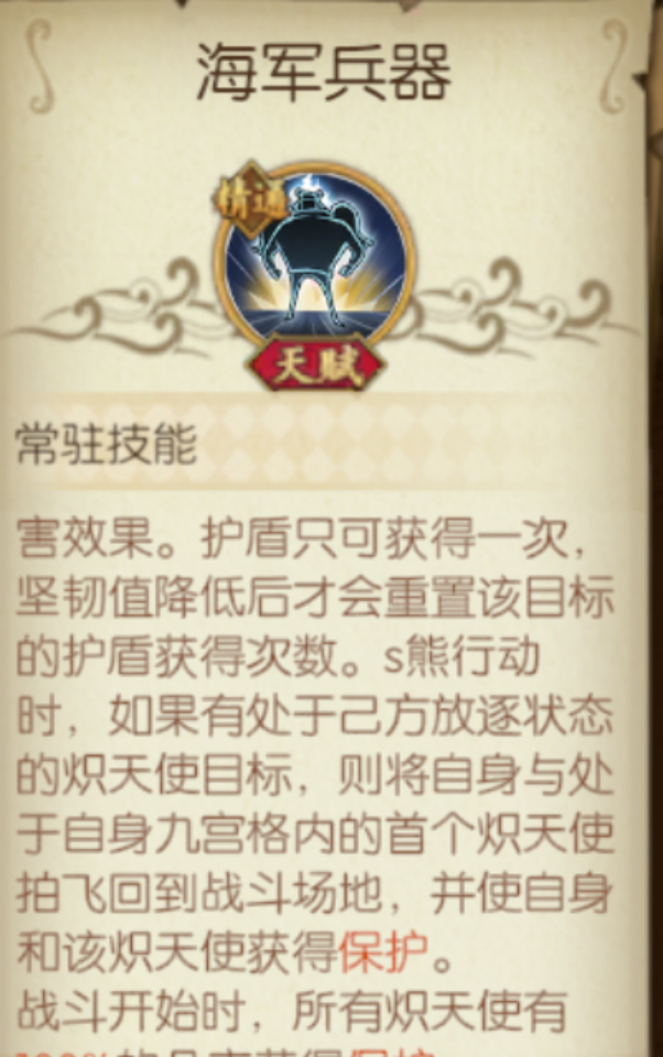 海军兵器:能够有效提升小熊的坦度,累积10层压力还可以刷新一次行动状态,并且吸收过量的坚韧伤害,这使得小熊的站场能力非常强,并且能够为自身和九宫格内的炽天使解除放逐,使所有炽天使开局就能获得小熊的保护效果。