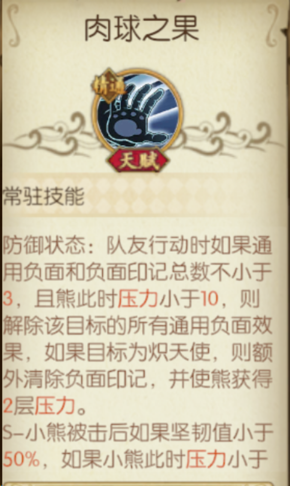 肉球之果:很核心的天赋,能够解除炽天使的负面印记和普通负面效果,同时也能解除5档路飞的橡胶化,并且还能恢复全体炽天使的坚韧值。