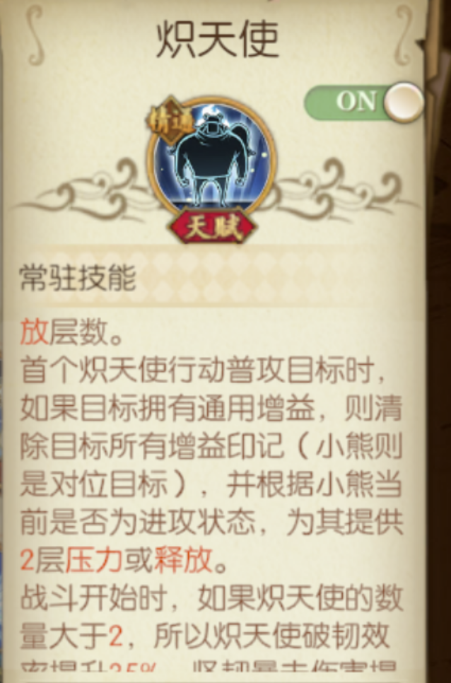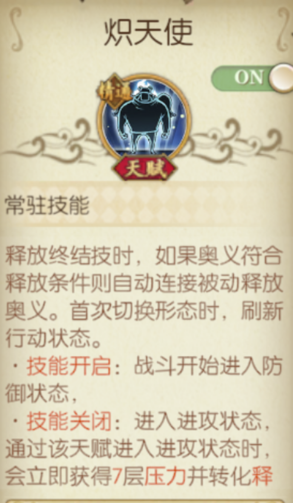 炽天使:该天赋建议开启,可以自行选择进入战斗后的形态。能大幅度提升所有炽天使的输出能力,并且清除地方的增益印记。