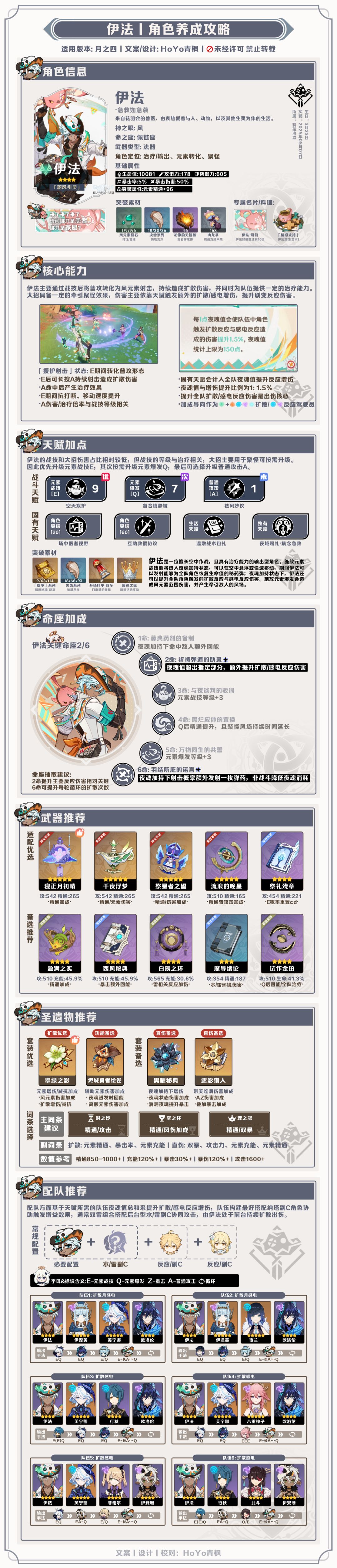 ●伊法主要依靠核心天赋基于队伍夜魂值总和,提升扩散、感电、月感电的反应伤害,通常最佳队友是欧洛仑,可在战技后为水/雷元素角色攻击时获得夜魂值,从而轻松触发反应增伤的上限,其次也可选择伊安珊借助前台移动射击触发彼此机制,搭配其他可触发对应反应的副C构建以感电为主的扩散队伍;