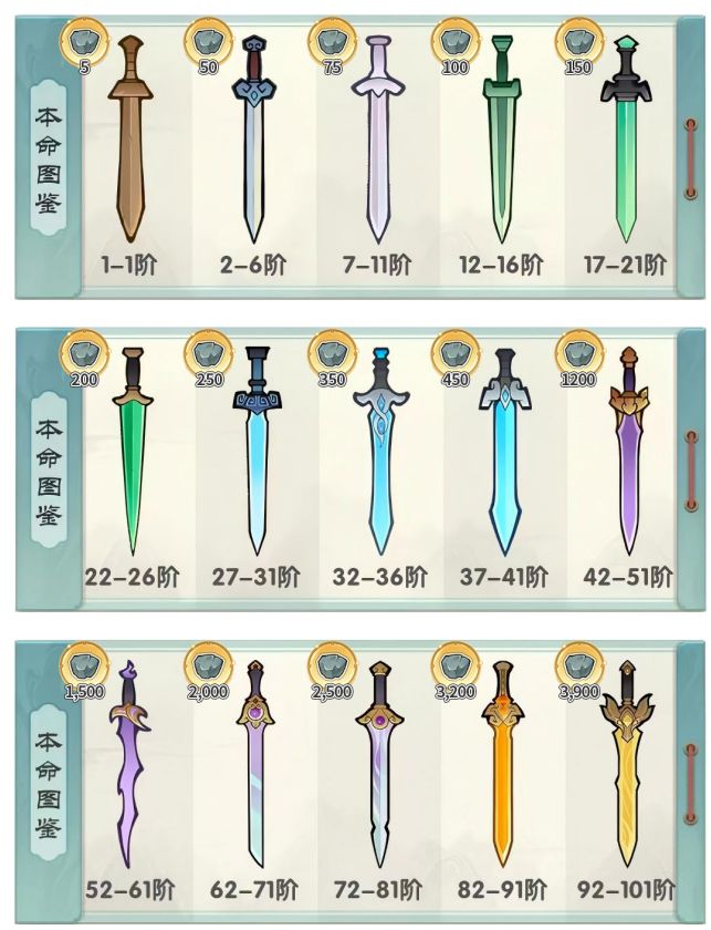 ,气象万千。(下图为本命剑形态以及升阶所需“秘砂”数量)