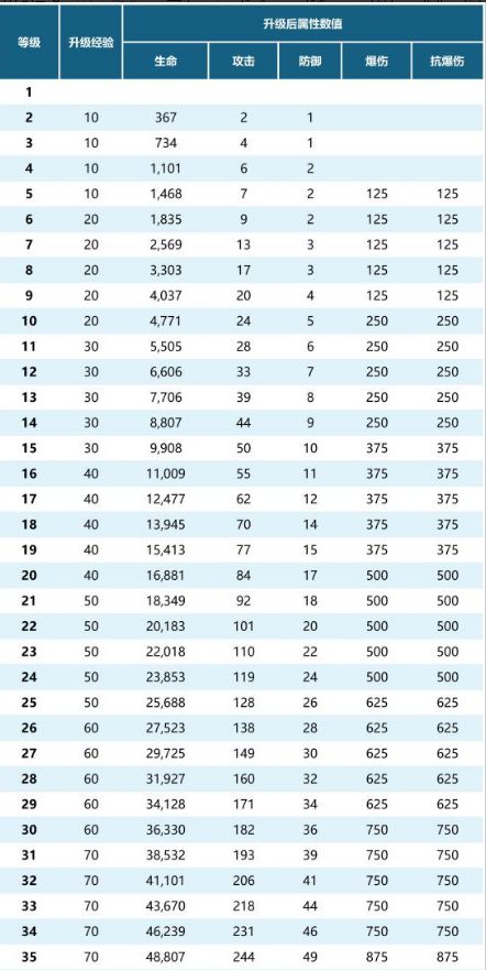 (下图为部分图鉴数据,升级所需经验值以及升级后属性数值)
