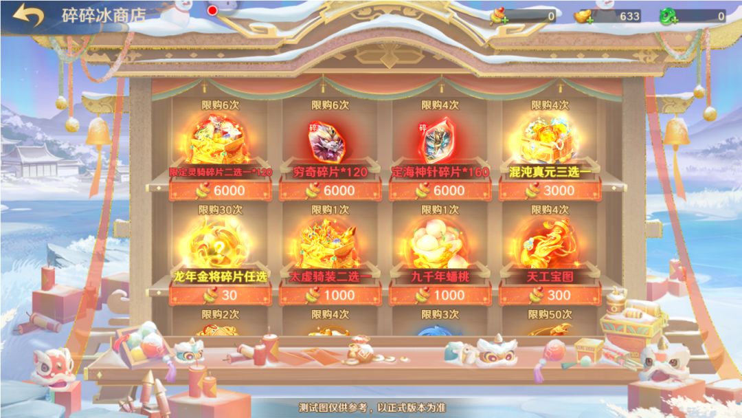 在碎碎冰当中获得的「冰糖葫芦」,可以在该商店内兑换各种珍稀道具,包括限定灵骑碎片二选一*120、穷奇碎片*120、定海神针碎片*160、混沌真元三选一、龙年金将碎片任选、太虚骑装二选一、九千年蟠桃等,可别错过~