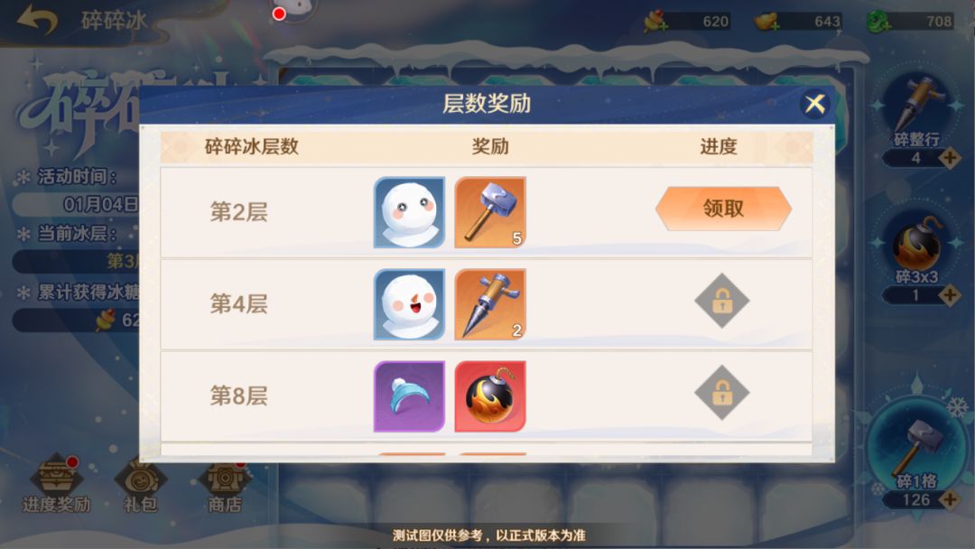 随着破冰进度逐渐增加,守护使能通过点击左下角的[进度奖励]按钮,来领取对应的碎碎冰层数奖励。此外,守护使还能在同样位于左下角的[商店]处,补充破冰道具,活动期间守护使可以在商店以元宝购买「冰锤」*20,还能每日免费领取3个「冰锤」,快去那边逛逛吧~