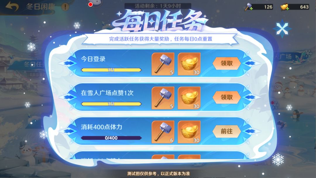 活动期间,守护使大人可在每日任务板块,通过完成对应任务,来获得活动道具「冰锤」与元宝奖励。任务每日0点重置,要记得每天来看看~