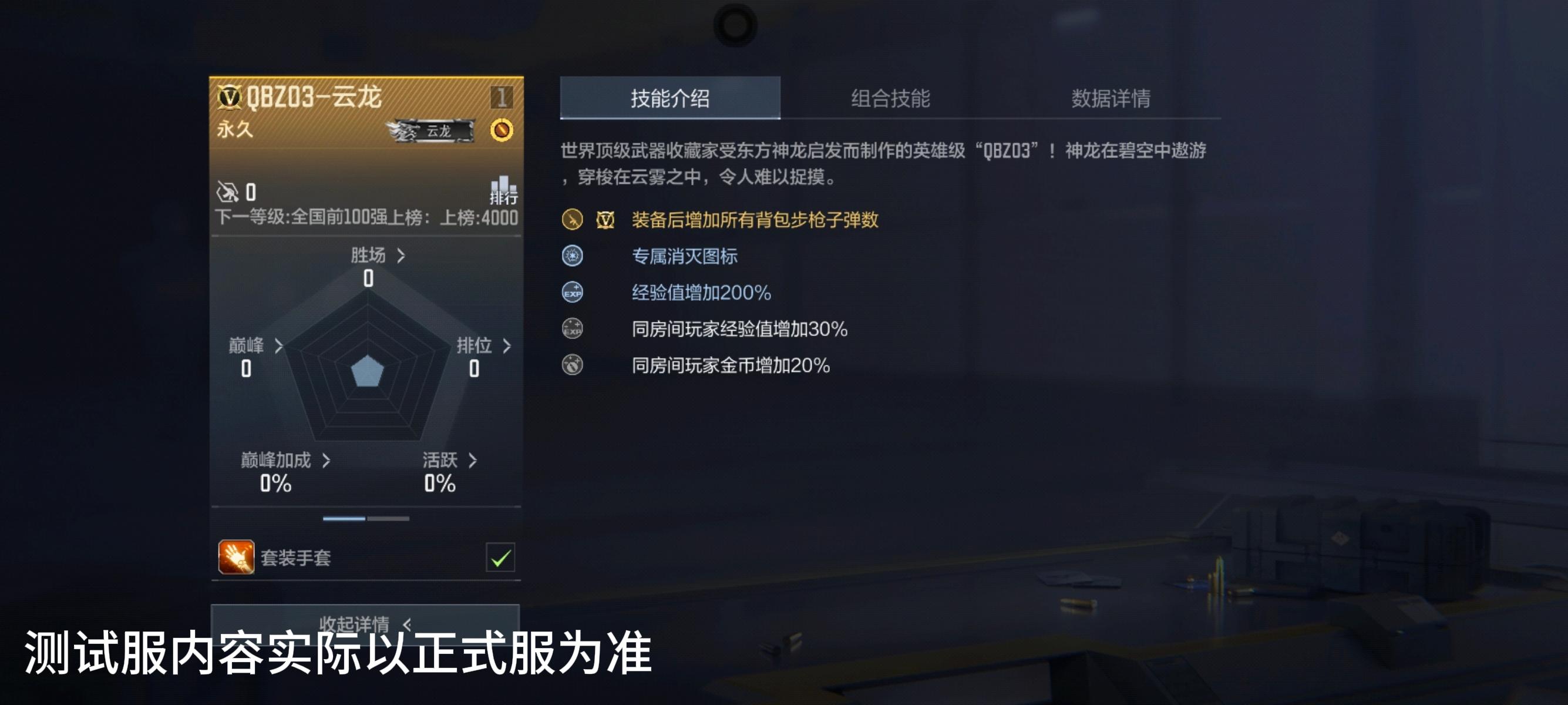 QBZ03-云龙的技能为装备后增加所有背包步枪子弹,提升了步枪的续航能力,增加经验值200%,同时还能够为同房间的玩家经验值增加30%,金币增加20%。