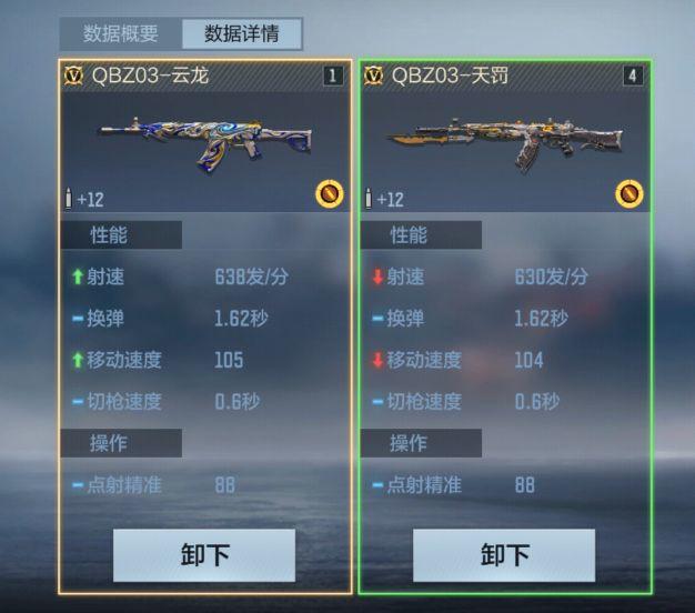 在性能方面,QBZ03-云龙的射速638发/分以及移动速度105都是优于QBZ03-天罚的射速630发/分、移动速度104,而换弹速度1.62秒以及切枪速度0.6秒和QBZ03-天罚的数值一致。