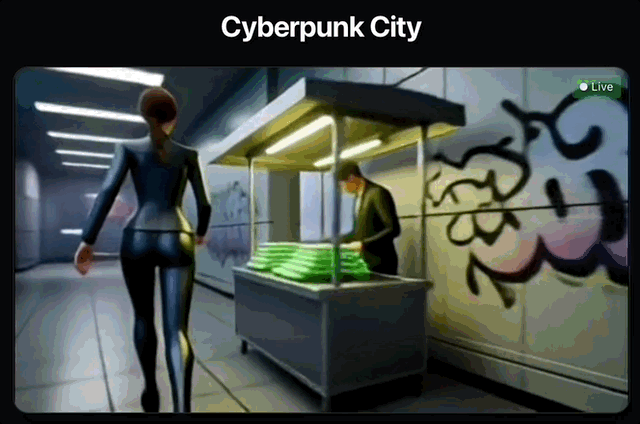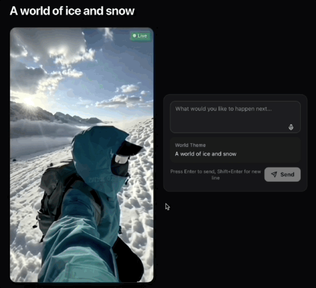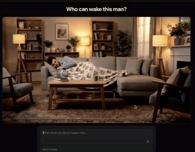 什么叫实时生成世界模型?简单来说,在这款AI模型中,用户只要设定好一个大概的世界观,它就能自己发展出一整段连续的画面和故事。就算用户不给它输指令,它也能自己「干活」。