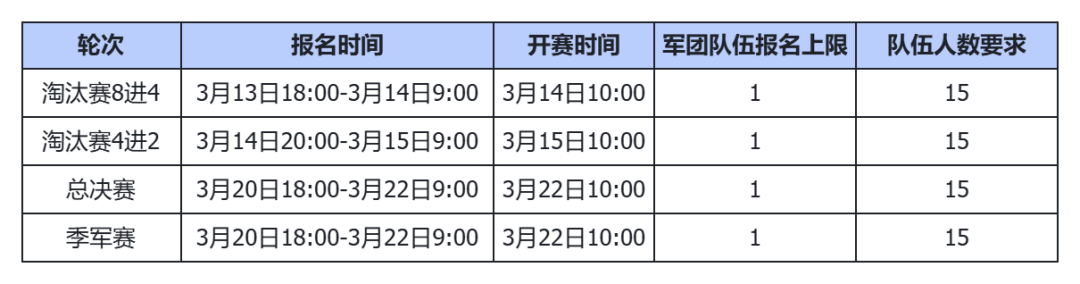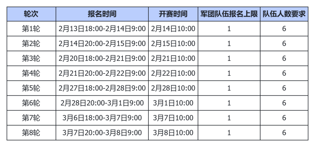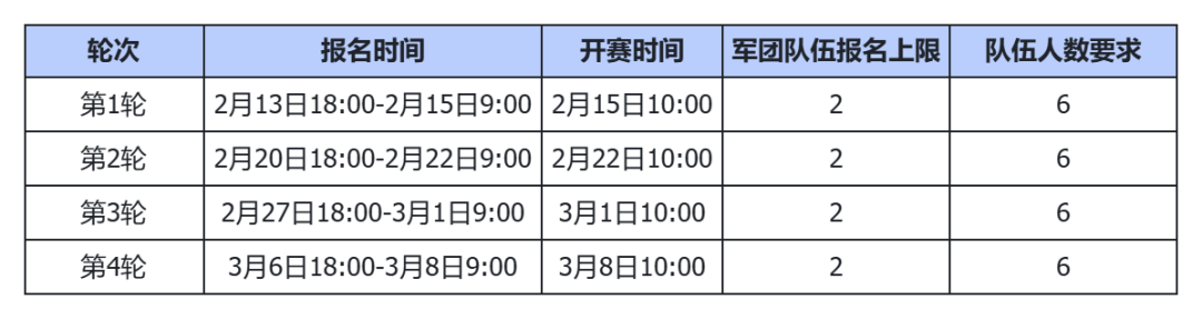 联赛持续时间:2月13日18:00-3月25日10:00