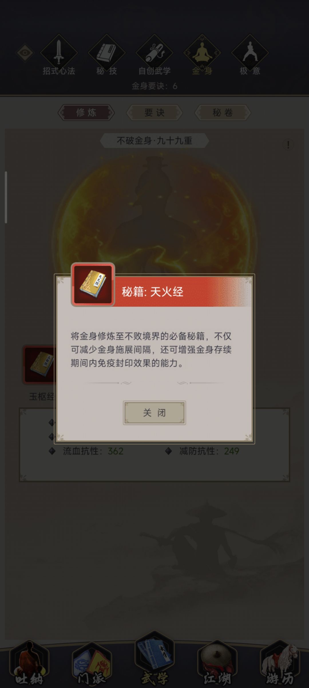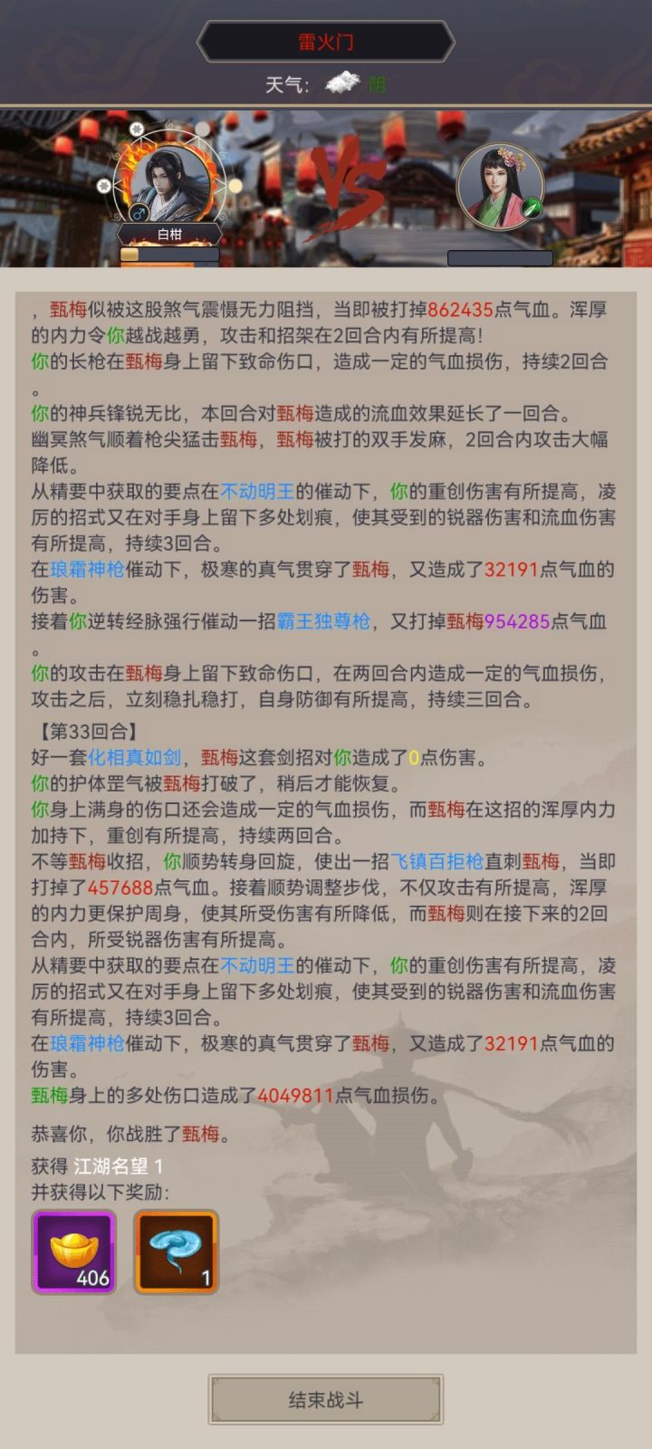 终于熬过雷火了,前天在少林寺比武台上把已经好久没上线的咱区第一给打下去的时候就觉得肯定能过甄梅了,昨天又把龙威给搞到手,今天也是一次就过。三象还差的远,金身也才到不破,还有的熬,技能也好久没整理了,现在活动送的那些八星武学我都给存着没用,实在是格子不够了。