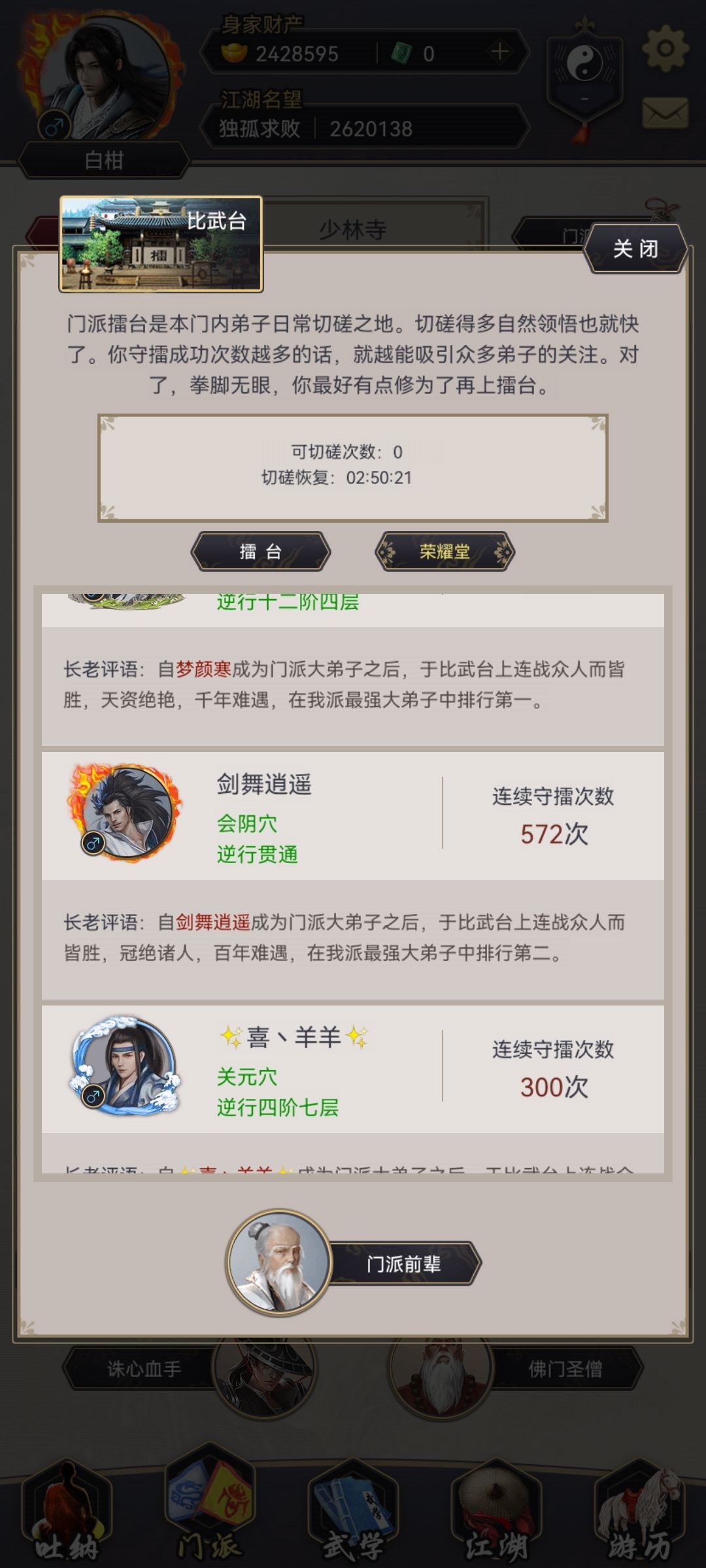 前天和往常一样在少林寺比武台拿大佬刷武学熟练度,突然给我跳出来个挑战成功,哈哈当时真的很意外,大佬玩的身法剑以前都是人家剩下半血,少林寺比武台的荣誉堂第二的数据全由我一个人贡献572次后终于胜过