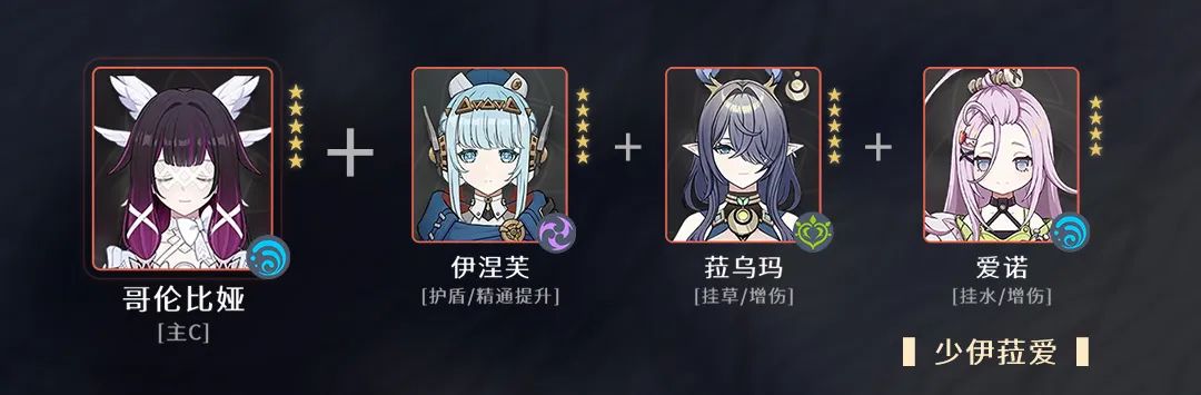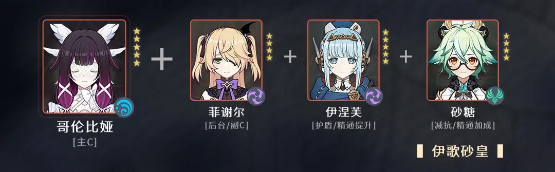 这是一套月绽放体系的高效配队,哥伦比娅站场重击当主C,生存与输出双在线。