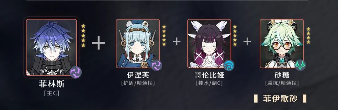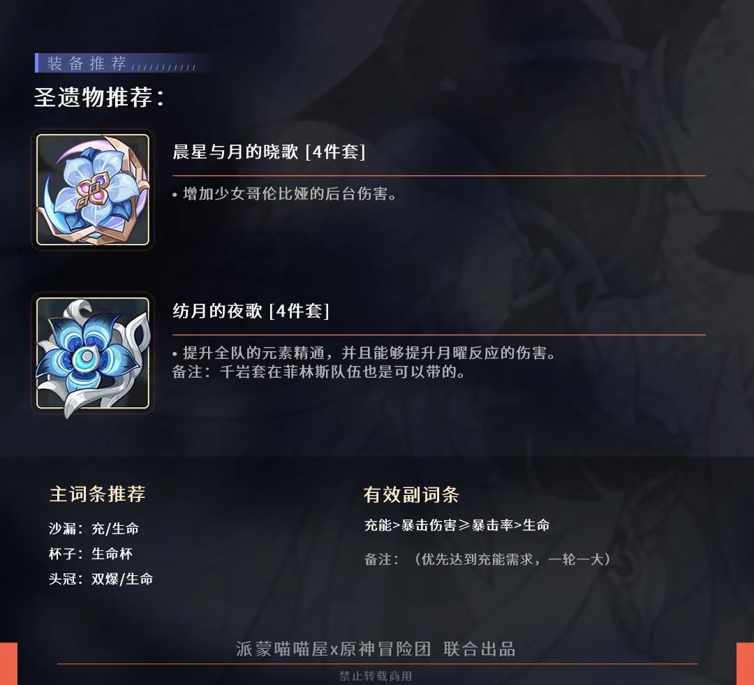 月感电的完全体配队,伊涅芙可以为菲林斯提供护盾、精通拐、还能不停产生元素球,是菲林斯的最佳队友;