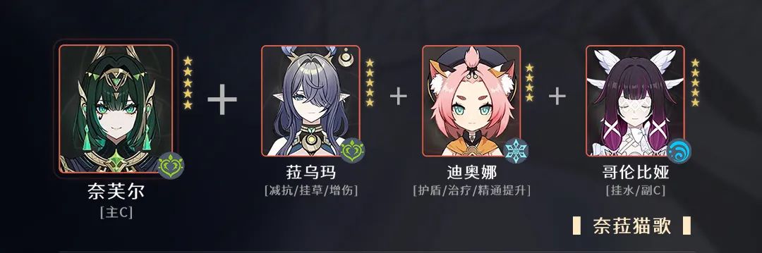 月绽放体系,奈芙尔与菈乌玛组成满辉阵容,菈乌玛带草套加上自身战技减少敌人抗性,大招增加月绽放的伤害,少女并且能提供额外的草露,优化月绽放的输出;