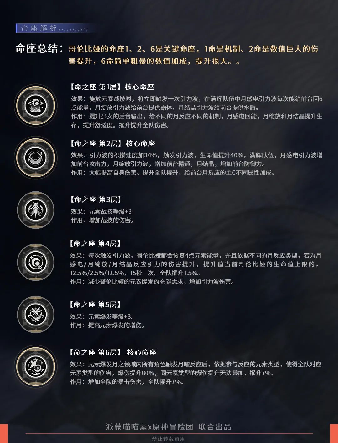 此外,哥伦比娅的每一层命座都会提供不同数额的全队全类型月曜反应伤害擢升,共20%