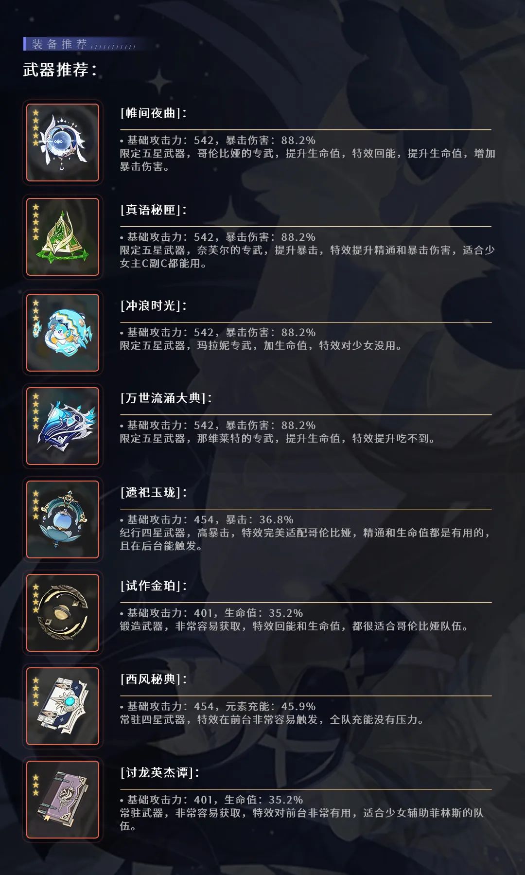 效果:哥伦比娅在队伍中,触发的感电/绽放/水元素结晶反应将转为触发月感电/月绽放/月结晶,根据哥伦比娅的生命值上限提升月曜反应造成的基础伤害