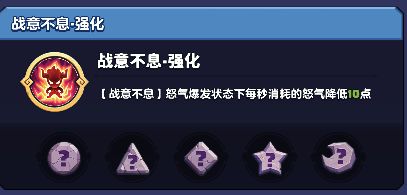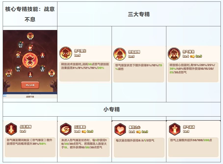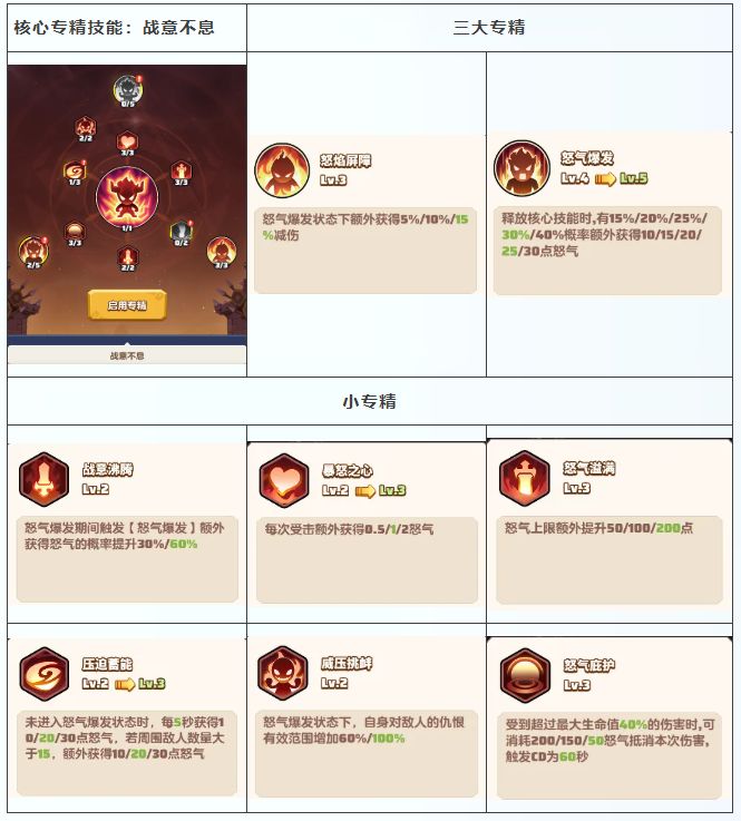 小专精 压迫蓄能+暴怒之心+战意沸腾+怒气溢满: 以提升怒气上限和加快怒气回复为主,为核心专精和三大专精提供能量支援,如战意沸腾可增加怒气爆发的怒气获得概率。