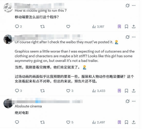 在海外平台X上也引发轰动,不过评论有点两极分化,国外粉丝盛赞其为“最伟大小说与伟大游戏的梦幻联动”,而有经验的玩家则担忧如此画面是否为“CG诈骗”,对全程无UI、无战斗演示的PV表达了谨慎态度。