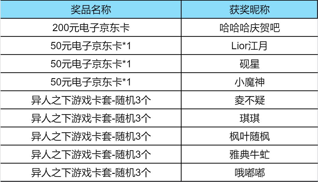 亲爱的玩家们,本次活动已经圆满结束啦,感谢大家的热情参与~现在就为大家公布本次活动的获奖名单~
