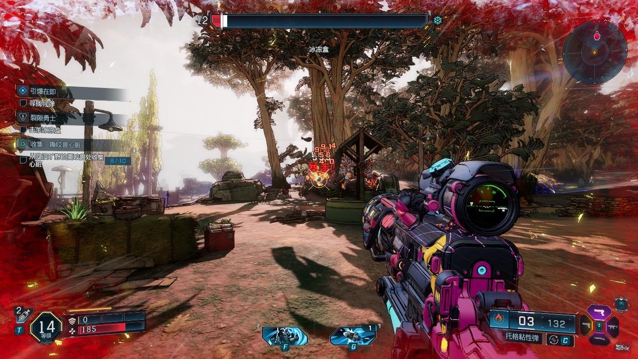 滑翔是当玩家在空中时,可以按住空格消耗空气背包进行空中移动。另外,如果在空中按奔跑键,就可以实现短距离冲刺闪避,在Boss战中非常实用。除此之外,本作的命中反馈也比前作更明显,爆头的红色暴击提示、击杀敌人时准心出现的大红叉和清脆音效无不刺激着玩家的荷尔蒙,鼓励秘藏猎人在这颗星球上大开杀戒。