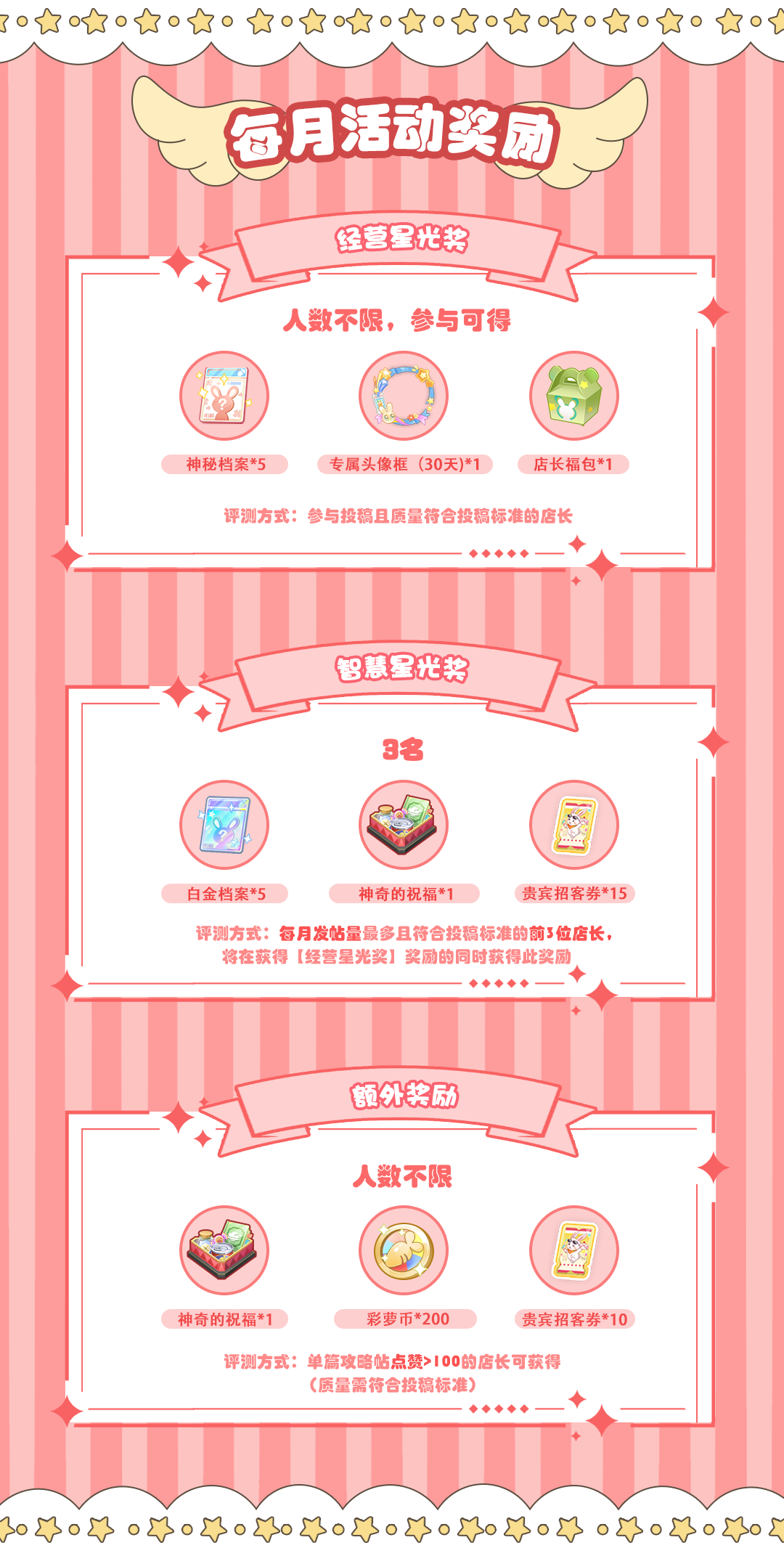 2)🥇每月发帖数(攻略帖)前三的店长还可以获得白金档案*5,贵宾招客券*15,神奇的祝福*1