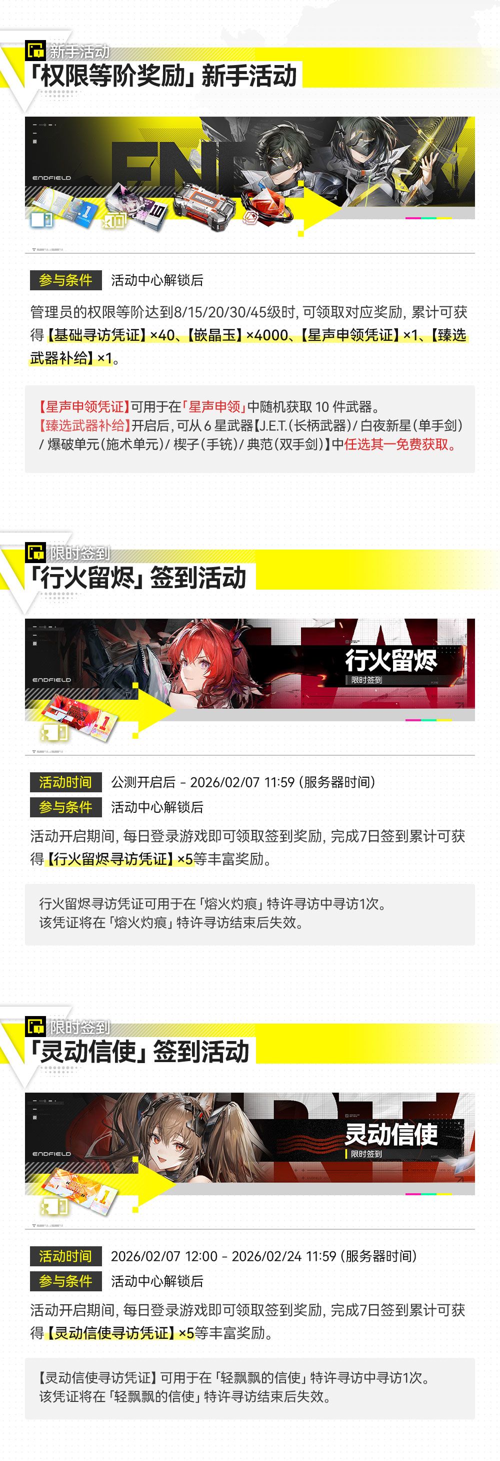 公测版本「零号委托」正式开启后,管理员可以通过各种活动累计获得价值135次的寻访机会、6星干员【艾尔黛拉】、6星武器【沧溟星梦(施术单元)】、6星武器自选箱【启程武器补给】、6星武器自选箱【臻选武器补给】、5星干员【昼雪】、5星武器【终点之声(双手剑)】等丰富奖励。