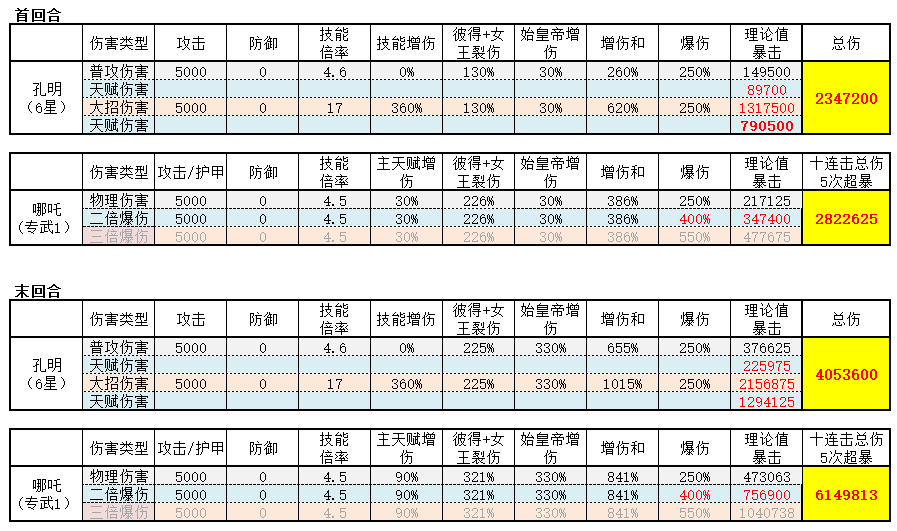以目前顶级物理卡6星火尖枪哪吒对比,哪吒因天赋暴击率加成,按50%概率触发二倍暴击伤害计算,因女王开大无视转增伤,哪吒伤害都领先于孔明