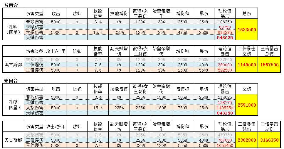 以目前平民输出卡奥古斯都举例,因黑猫自带100%暴击,可以通过堆叠暴击达成3倍爆伤的效果。首回合孔明因大招高额增伤,输出远高于黑猫,后续增伤提升,孔明自身增伤被稀释后,奥古斯都3倍暴击伤害大致与孔明相同