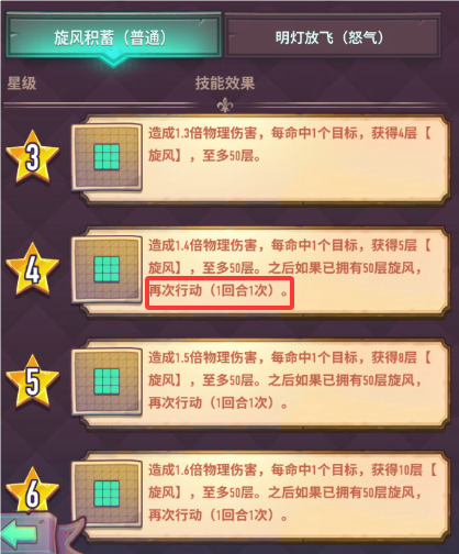 普攻可获得【旋风】层数,4星解锁再次行动。天赋『死亡旋风』每有10层旋风额外造成1次10%伤害(上限6次)