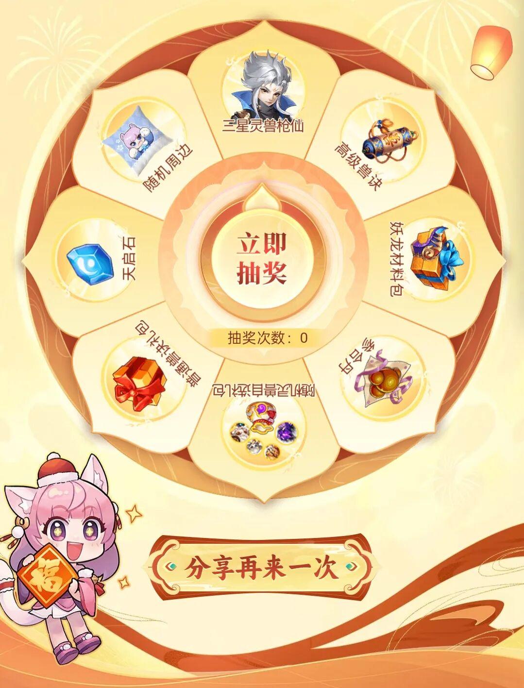 2、活动期间,少主每日登陆页面可获得1次抽奖机会,将页面分享给好友,链接被成功打开后,少主可额外获得1次抽奖机会(每日上限1次)。