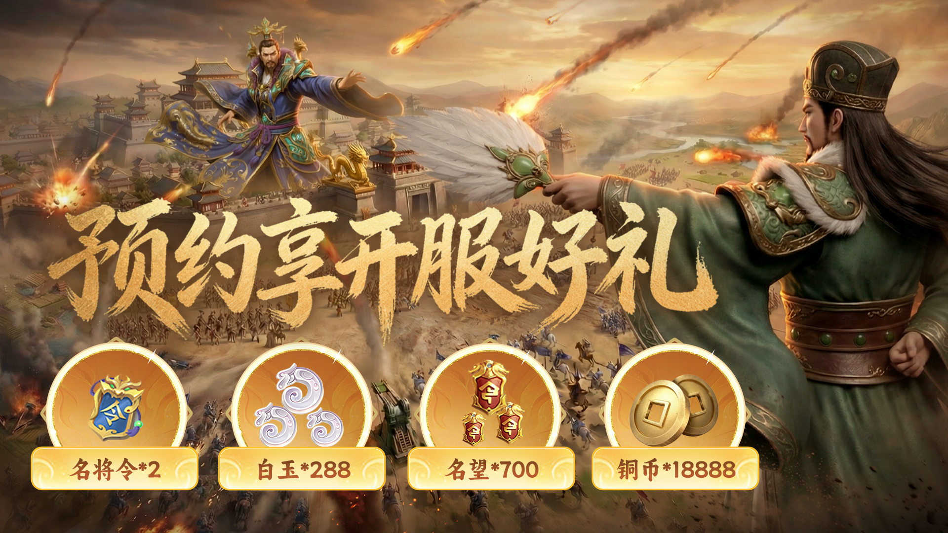 在战盟点击参与畅玩服预约,上线即可领取预约奖励:名将令*2、白玉*288、名望*700、铜币*18888