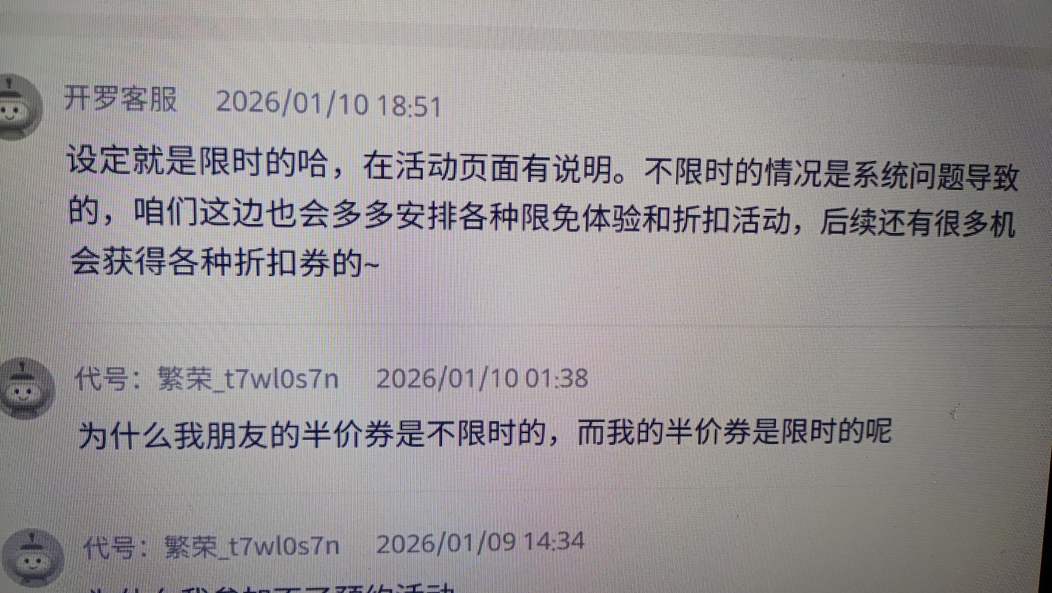 我领取的半价券是限时的,但是我朋友领的全是永久的,后面我发现论坛的朋友也是永久的,我问了客服说是bug,作为一个内测开服老玩家,其他雷霆游戏也都有支持,希望给个说法,既然错发礼物都要归档将就公平,半价券永久这一块是不是也应该如此呢