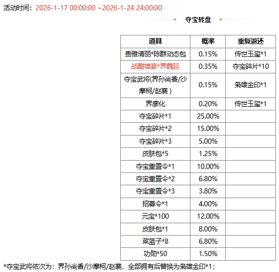 *2026-1-17 00:00:00 ~2026-1-24 24:00:00,贵雅清丽*陈群动态包 180夺宝碎片、战酣雄豪*界魏延 100夺宝碎片 限时上架夺宝商店。2026-1-25 00:00:00 起,贵雅清丽*陈群动态包、战酣雄豪*界魏延下架。