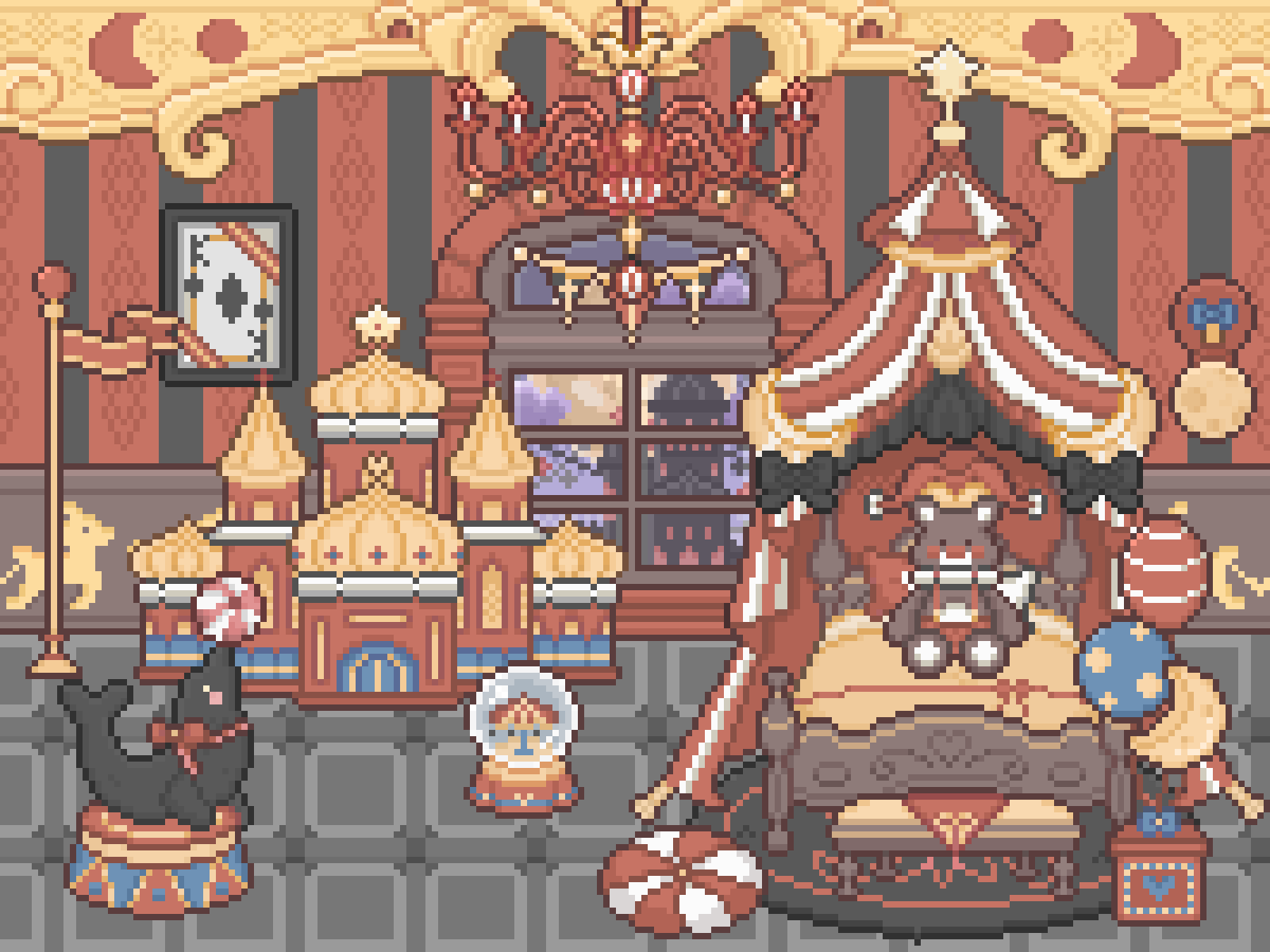 这是一套温馨的日常风格小房间,包含14个部件,使用游戏中经营获得的小爱心即可购买。