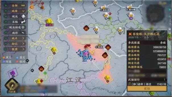 S3-9区的战火在江汉持续蔓延,【雄图霸业】与【珈蓝神殿】陷入持续缠斗。1月15日上午,【珈蓝神殿】尝试在7级城都阳周边建立烽火台夺取城池,不过迫于对手压力本次行动以失败告终;同时,他们的8级城零陵也在承受【雄图霸业】的猛烈进攻,防线承受重压。