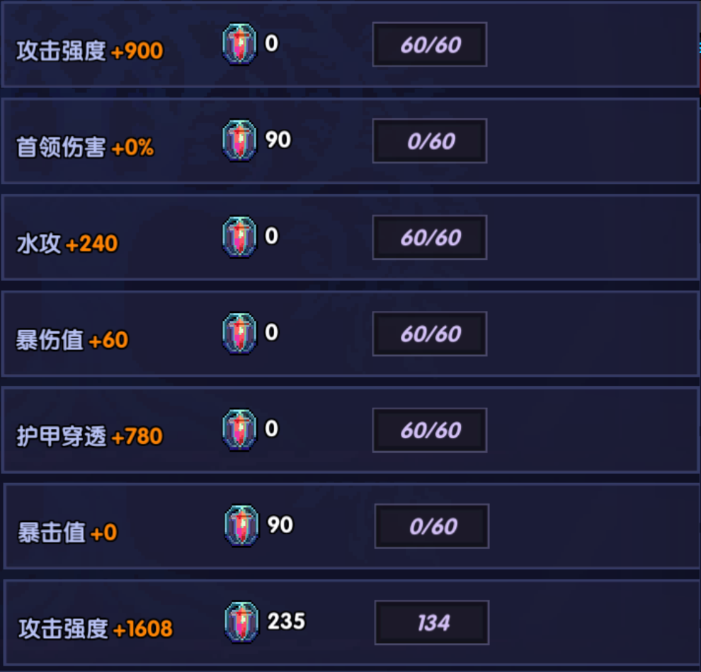 - 防具卡:主属性攻强百分比+副属性水功/攻强