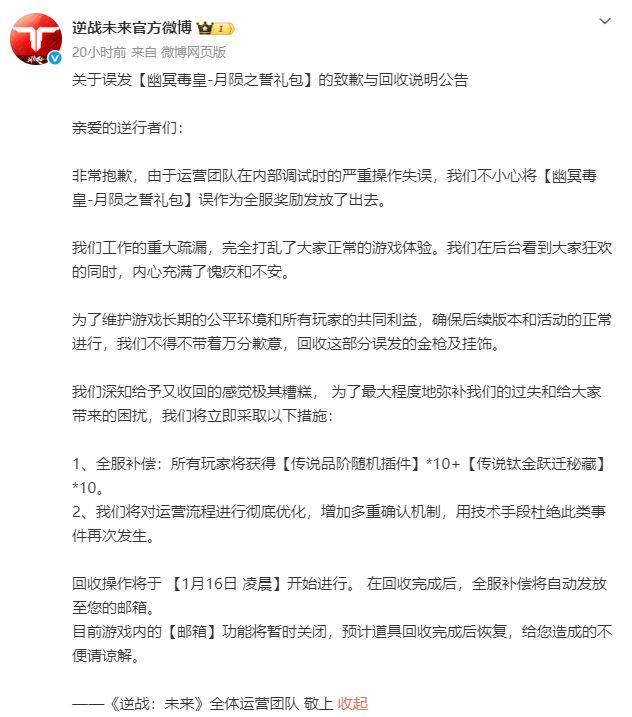 《逆战未来》运营团队发布致歉公告,就1月15日误发【幽冥毒皇 - 月陨之誓礼包】事件向全体玩家道歉,并公布回收与补偿方案。