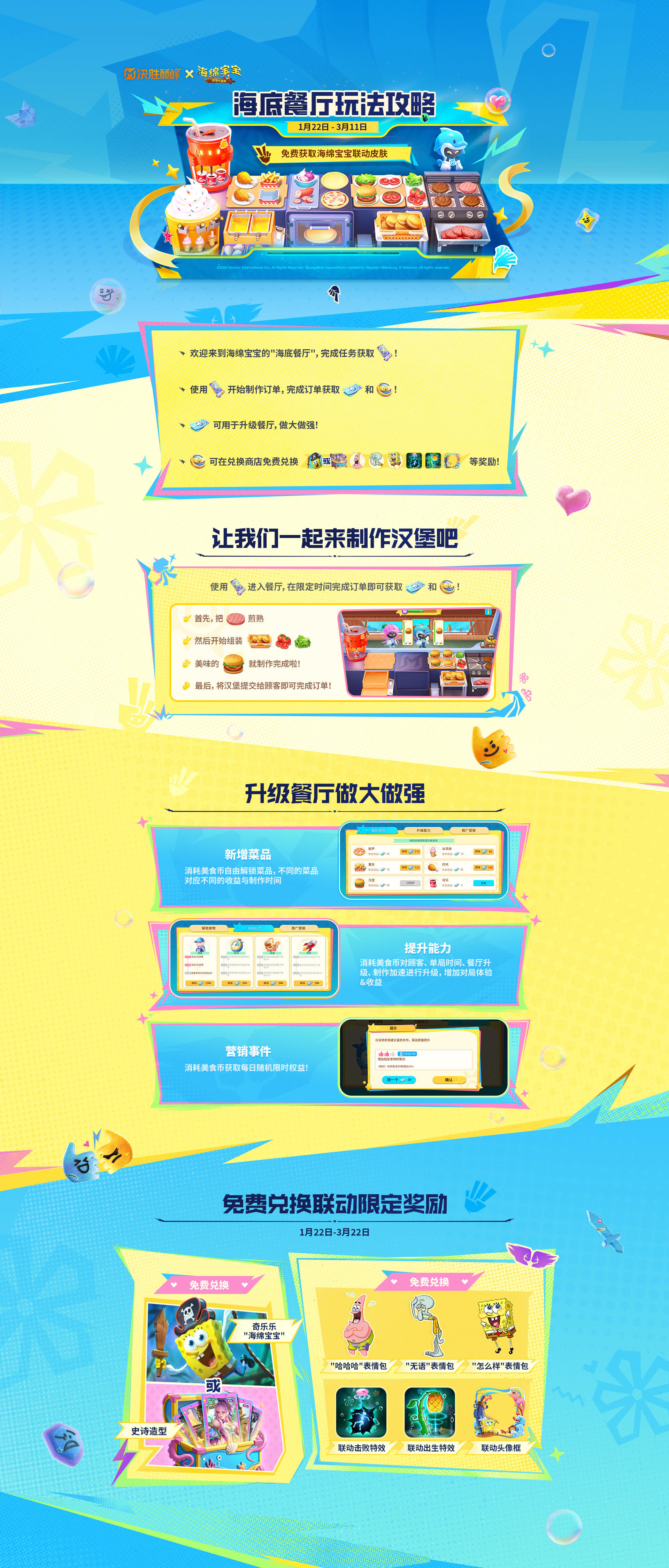 海绵宝宝与派大星的联动皮肤、比奇堡联动特别玩法,这次由你来成为比奇堡餐厅主理人。