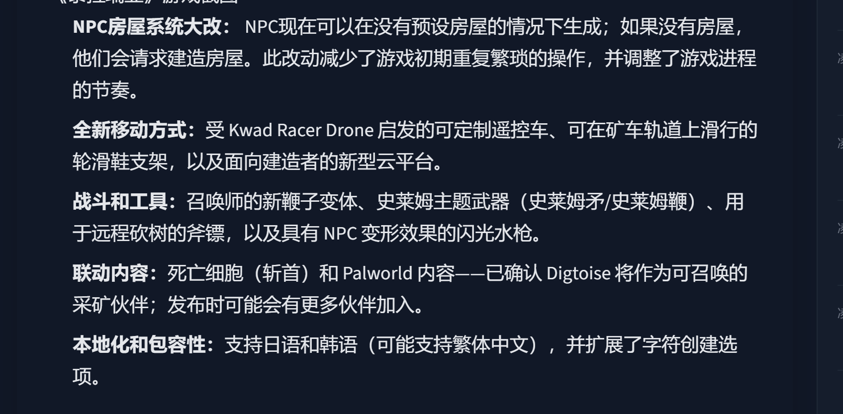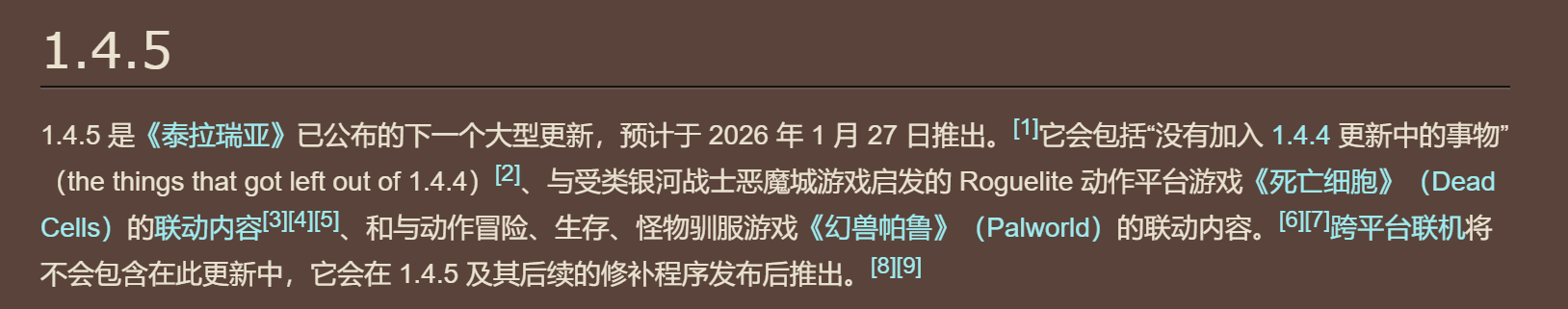 - 《泰拉瑞亚》1.4.5版1月27日上线!新增死亡细胞联动、幻兽帕鲁宠物、鞭子武器、家具套装等海量内容,跨平台联机暂未推出。
