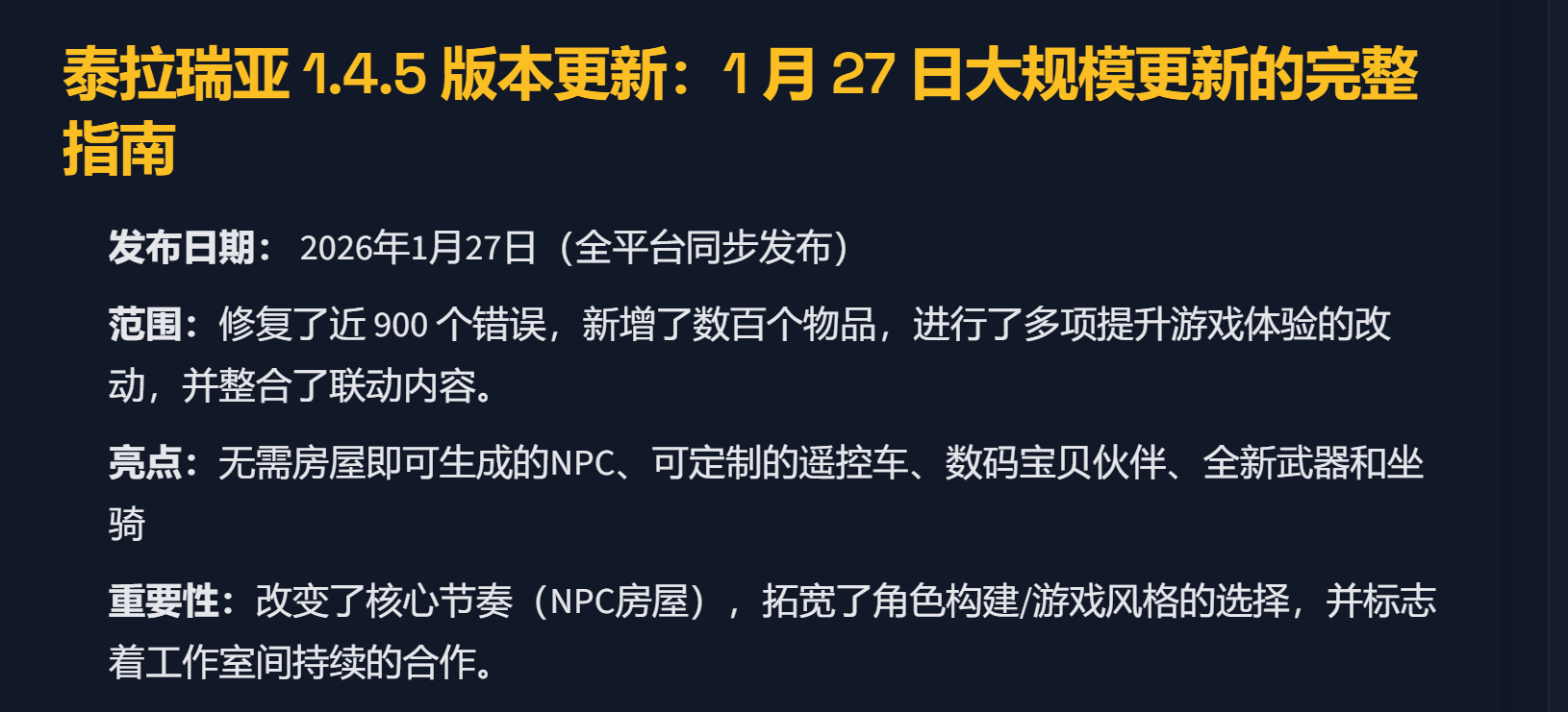 对于习惯“刷一刷节假日热度”的游戏而言,《泰拉瑞亚》仍在用内容打动玩家。1.4.5 不只是一个版本号,它承载了: