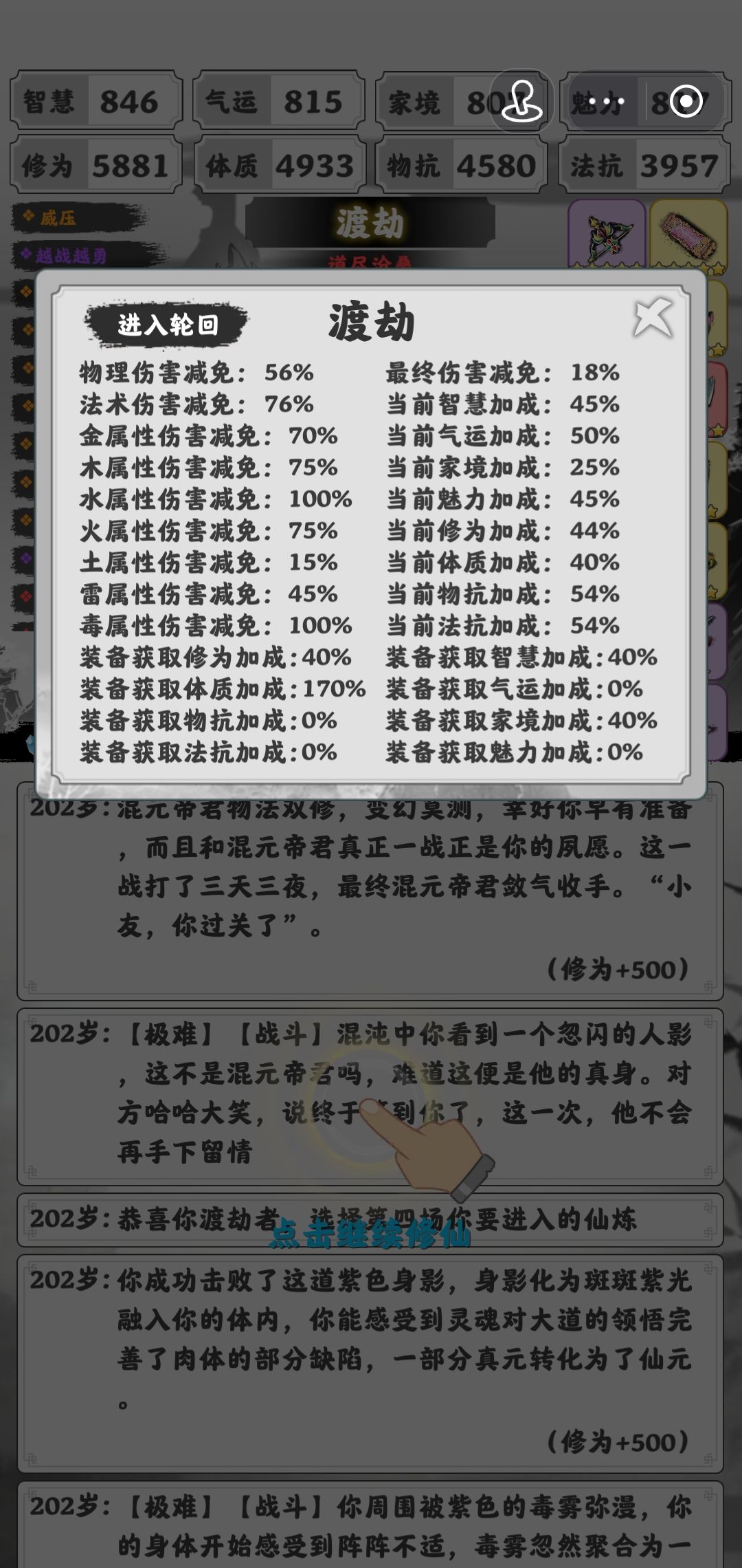 这把道中并不好,打142吃了6w+物理伤害,装备方面出的有问题,这小雷枪纯属东施效颦,不如干脆补鼎+火扇,这把甚至不出75雷抗也能极限过,当然不是每把都有这个宠物。实际上极难也没少跑,171没出现,邪眼也跑路了。金毒道中确实也不卡格子,182买智慧冠,197前最后一格出雷戒凑100雷抗,然后换土钟,199可以自由补一件(实则200也可以),感觉金毒局并不需要太在意魅力,最后土钟换个钗子也就了事了。丹药我总是记不住吃了什么,这把可以确定的是1修为(看女帝那还没渡劫有点急眼了)1魅力2气运3家境,再多的就不知道了。家境这块倒是无所谓,最后稍微低一点也没问题,法圣+60,应该是689家境进的法圣,最后补了3→4星补天石,最后刚刚好。