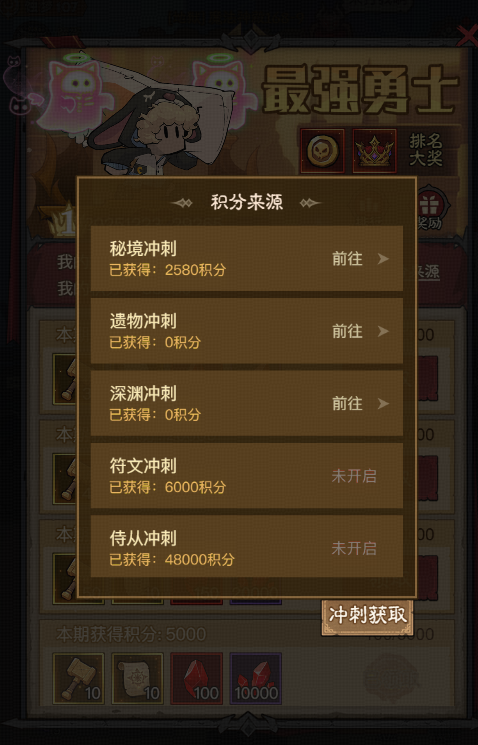 1.当前开启的冲刺活动可以获得对应数量的勇士积分。