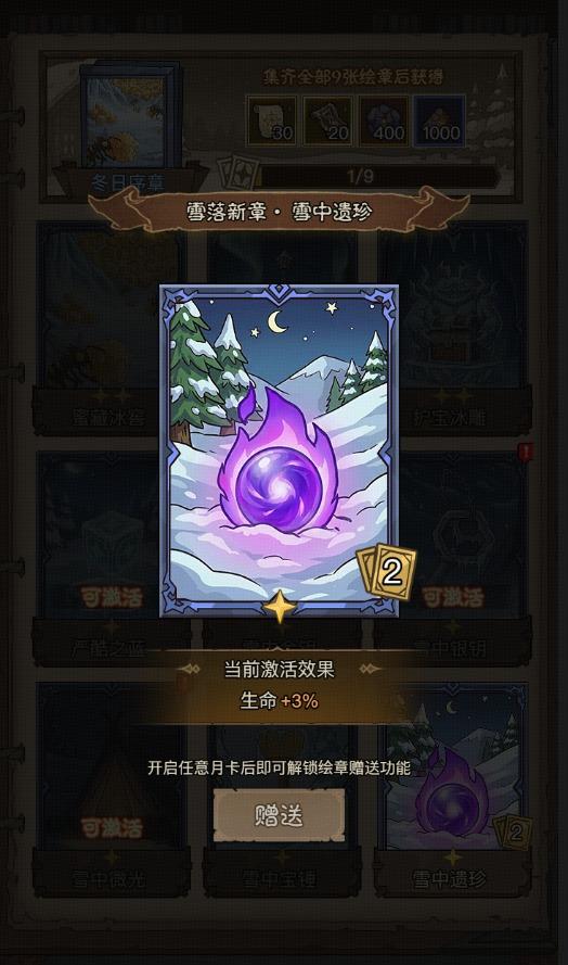 5.当某一绘章激活完毕后,多余的相同绘章可以进行赠送,玩家开启任意月卡后即可在具体绘章界面进行赠送。