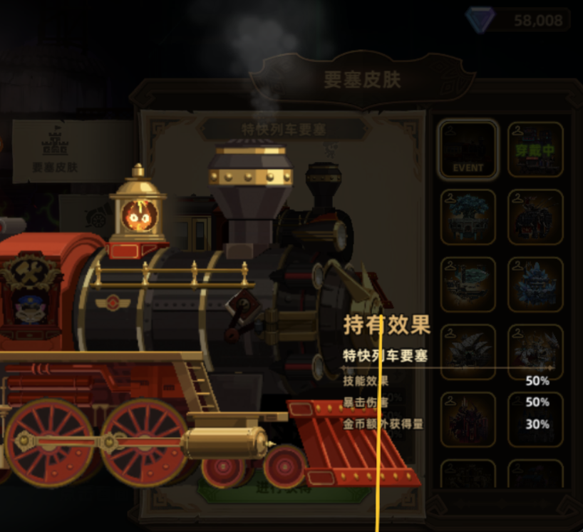 火车头皮肤我并没有氪,但依然可以在预览里看,从下图可以看到火车头的炮口大概在“持有效果”四个大字的“有”字附近。
