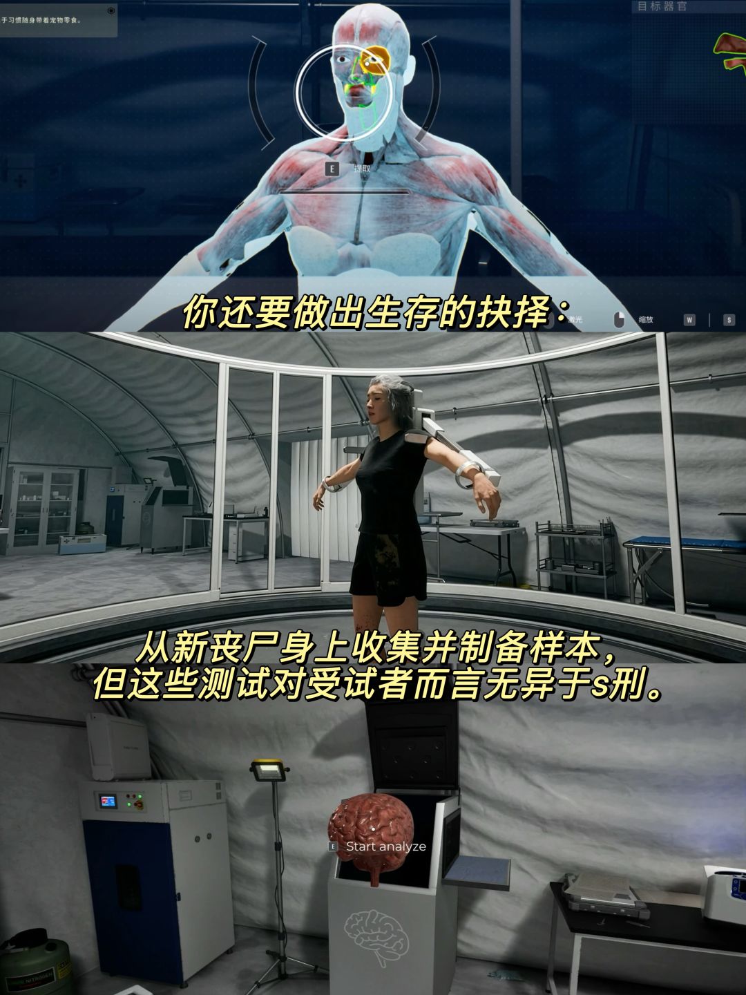 ✅你还要做出生存的抉择:将新生成的丧尸圈禁起来,从它们身上收集并制备样本,但这些测试对受试者而言无异于s刑。你要怎么选择?