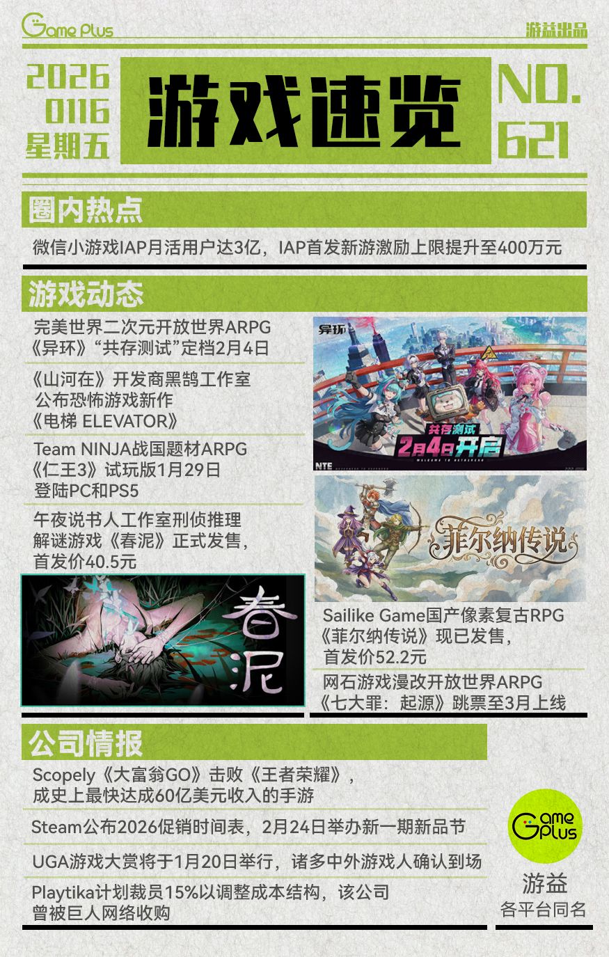 1.微信小游戏IAP月活用户达3亿,IAP首发新游激励上限提升至400万元
