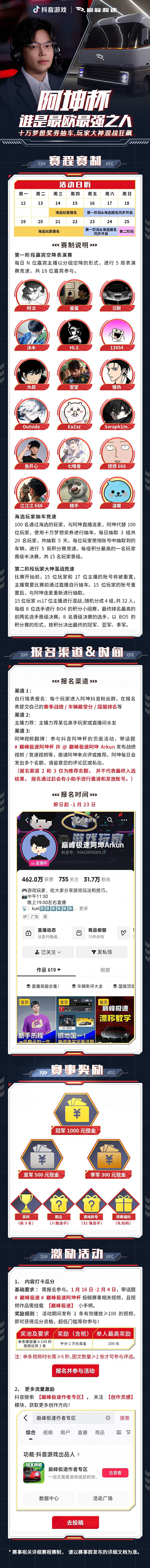 - 第一阶段(1月16日起):阿坤直播间连麦抽车+多轮积分淘汰赛,每日决出3名晋级选手,最终诞生15强玩家进入终极混战!